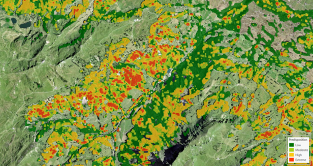 - Predisposition Maps: A set of spatially continuous maps that highlight those forest areas that are particularly susceptible to bark beetle infestations, windthrow, and snow breakage. The maps will incorporate numerous forest structure parameters and site factors, including the protective role of forests against rockfall and avalanches. The aim is to support a holistic approach to forest management prioritization, enabling targeted interventions.