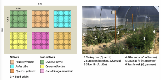 In the Polytunnel Greenhouse Experiment, seedlings of native beech (Fagus sylvatica), sessile oak (Quercus petraea), and silver fir (Abies alba) are grown alongside Douglas fir (Pseudotsuga menziesii), Atlas cedar (Cedrus atlantica), and Turkey oak (Quercus cerris), three species that are non-native to the Swiss Plateau. For each species, seeds of four different origins were used to grow seedlings in a nursery in Switzerland. The 2-yrs-old seedlings were transplanted to the experimental sites in autumn 2021.