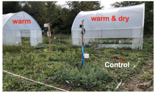 Climate treatments include control plots, plots with warming and plots with combined warming and drought. The passive warming by the polytunnels reaches 2–5°C during daytime (0.1°C during the night). By intercepting ambient rainfall, the greenhouses also provide a drought treatment. A drip irrigation system is run weekly to add ambient rainfall to one half of the greenhouses, and 50% of ambient rainfall to the other half.