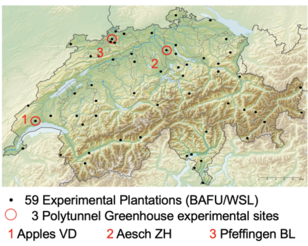 The Polytunnel Greenhouse Experiment includes three experimental sites on the Swiss Plateau, where air temperature and precipitation are manipulated by means of polytunnel greenhouses from 2021–2029. The three sites are part of a larger network of Experimental Plantations by WSL and BAFU, where 18 potential future tree species are grown at 59 sites across Switzerland.