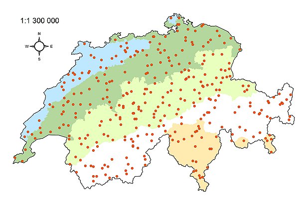 500 plots of 500 m2 size have been distributed across Switzerland, stratified according to biogeographic region, vegetation level and vegetation unit (forested/not forested). Within the plots, the presence of all lichen species was noted. As the plots constitute a representative subsample of the Swiss landscape, they serve primarily as indication of the relative frequency of the species.