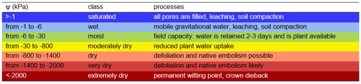 Soil water potential (kPa) defines the ability of water to move through the soil or to be extractable by trees. A lack of water can enhance forest fire risk and has direct (e.g. defoliation and increased mortality) and indirect effects on forests (e.g. increasing the susceptibility to insect attack, diseases or windthrow). During moist conditions, on the other hand, contaminates and nitrate can be leached to the groundwater. Wet soils are also more susceptible to soil compaction by heavy machinery and risk for slope instabilities, and soil erosion rises.