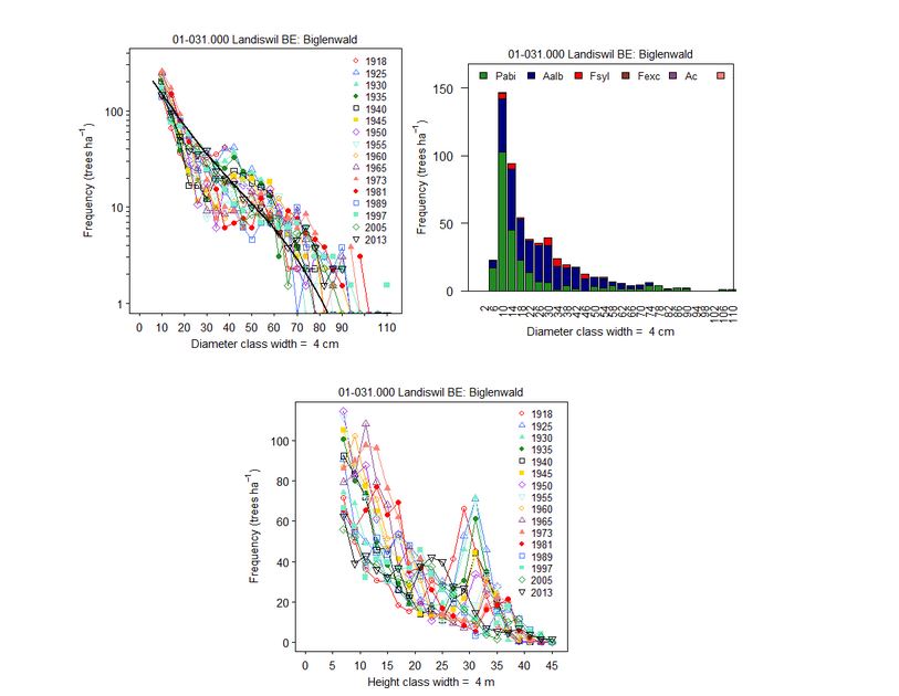 Figure 1. Example diameter distributions for a Picea abies – Abies alba plenter plot (1-031.000). The solid black line in the upper panel indicates the “equilibrium” state of the plot and shows a ln-transformation of the frequency on the y-axis. The middle panel indicates the species composition of the last measurement, with no ln-transformation of the y-axis. The lower panel shows the height distribution, which will have a reverse-J shape (as it does, roughly), if there is a vertical structure with trees of many heights within the canopy.