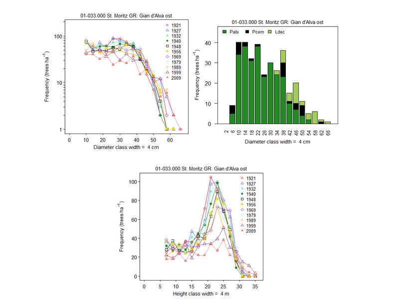 Figure 2. In contrast to the figures above, this figure shows a mountain Picea abies – Pinus cembra – Larix decidua forest that is in a stage of conversion towards a plenter structure (1-033.000). Note that there are still too many trees in the middle and upper diameter and height classes. However, this overabundance of large trees has been reduced with each thinning, as shown in the lower panel.