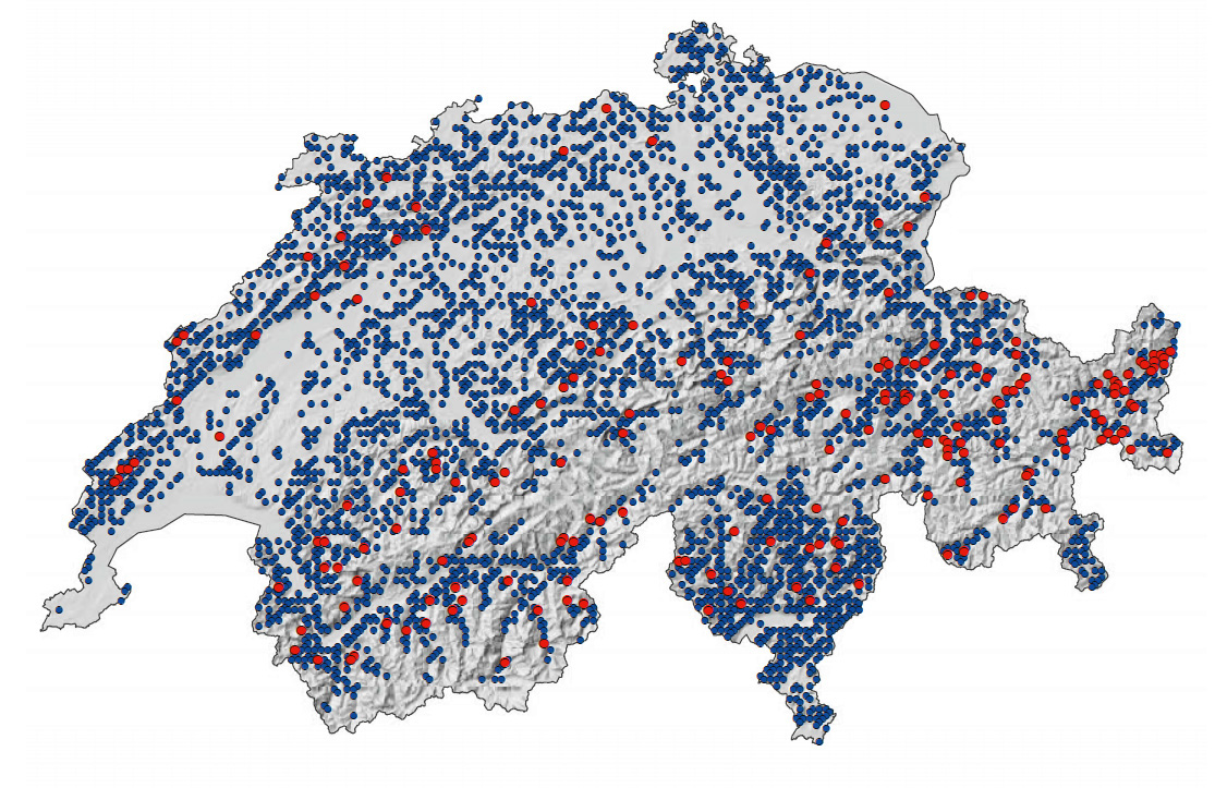 Mitarbeiter des Landesforstinventars haben zwischen 2009 und 2014 in der ganzen Schweiz die Haufen der Roten Waldameisen erhoben. Nadelbäume, Morgensonne und offene Waldstrukturen wirken sich positiv auf das Vorkommen von Ameisenhaufen aus.