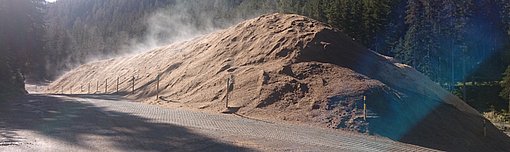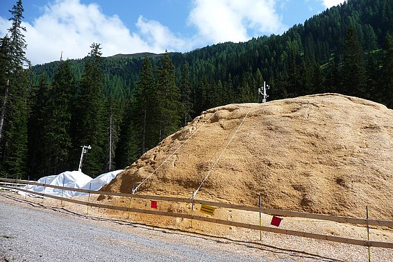 The first field trials on snow farming were carried out in 2008 in a joint project by the SLF with the local authority and tourist board in Davos to examine the feasibility of snow farming at lower altitudes and identify the most effective covering methods. This showed quite clearly that a thick layer of sawdust offered significantly better protection against melting than comparatively thin geotextiles. Under the cover of sawdust, barely a quarter of the snow melted. In the autumn, a 500-metre cross-country skiing trail was built from the remaining snow pile. Following this success in 2008, the local authority in Davos has continued and expanded its snow farming operations. Enough snow is now conserved over summer to build a four-kilometre trail in late October.