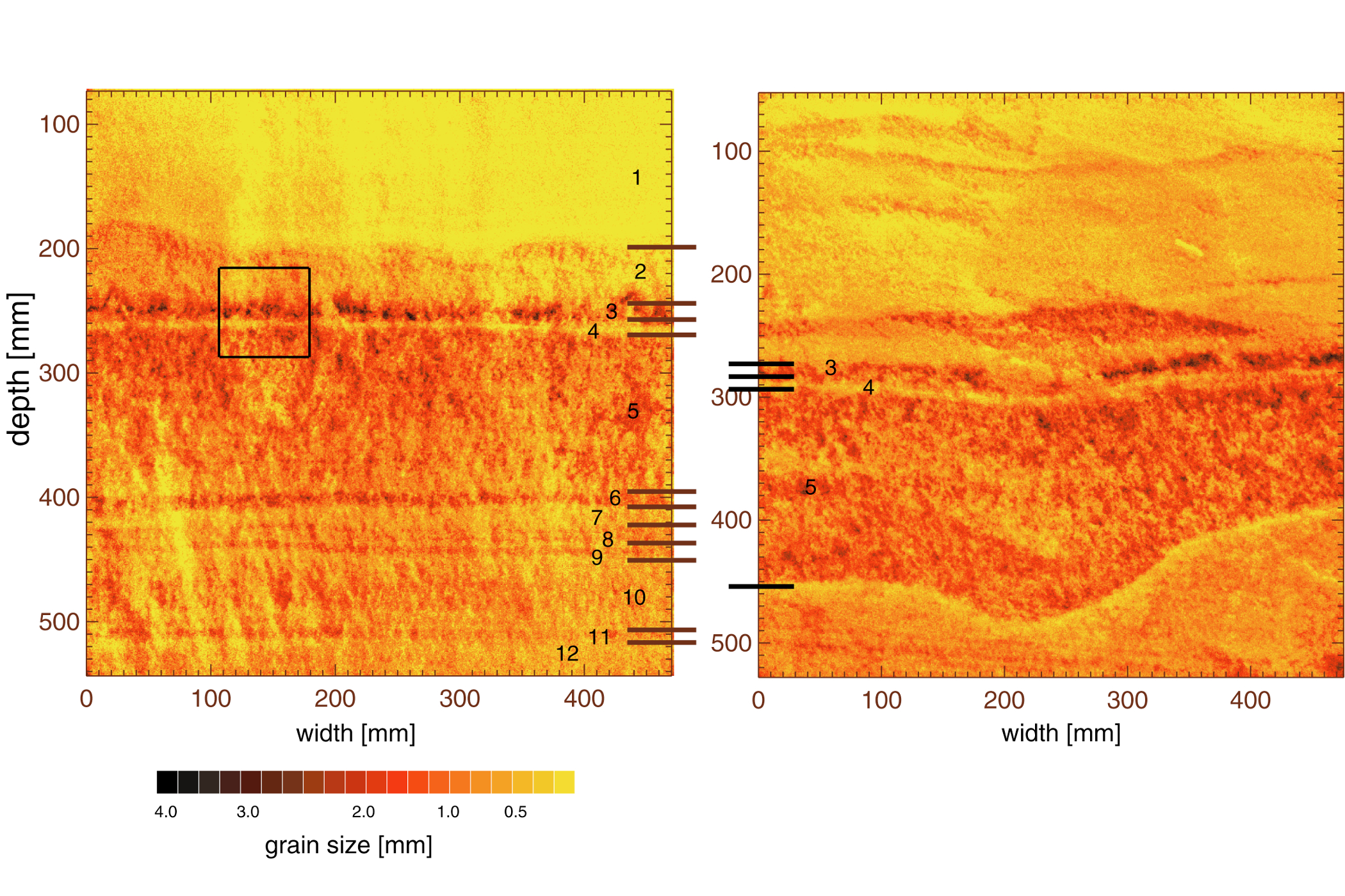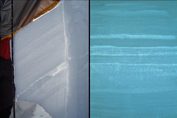 Dans un premier temps nous photographions la surface de la neige sous des angles divers. Les prises de vue seront plus tard traitées par photogrammétrie pour nous donner la valeur de la rugosité de surface. Puis nous effectuons les mesures avec le SnowMicroPen, un instrument qui détermine la résistance à la pénétration. Maintenant il ne s’agit plus que de creuser. Si seulement c’était si simple ! La pelle est à peine enfoncée à moitié dans la neige que le sol, ou plutôt la glace, oppose une résistance farouche. L’épaisseur du manteau est pour l’instant encore faible. Nous devons nous contenter de profils d’une hauteur de 8 à 30 cm.