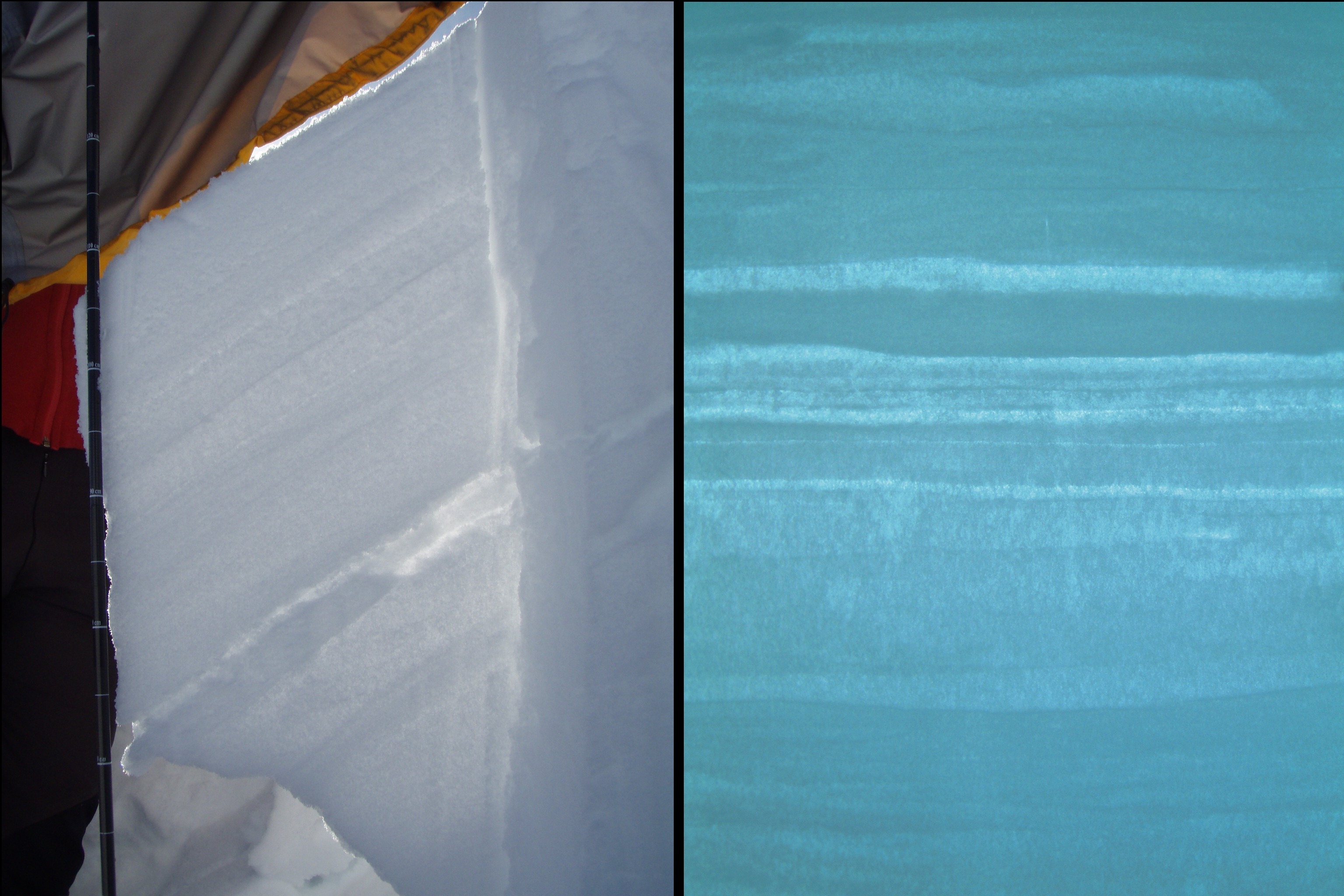 Ces sites n’ont bien entendu pas été choisis au hasard. On a tout d’abord essayé de déterminer les configurations stratigraphiques existantes. Le manteau neigeux peut reposer sur une glace de l’année, sur une glace pluriannuelle ou encore sur une crevasse dans la glace qui s’est ouverte avant de regeler. Nous nous rendons à tour de rôle sur ces différents sites et déterminons, grâce à un profil de neige, l’état physique et chimique du manteau neigeux.