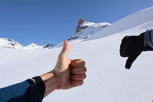 Avant l'exercice de prise de décision, les observations peuvent être échangées, mais si possible sans être évaluées. Ensuite, les participants votent sur une question clairement définie à l'aide de pouces vers le haut/vers le bas. Après le vote, les décisions sont justifiées et transformées en décision de groupe. Le droit de veto de chacun s'applique. Pour cette prise de décision, chaque participante a besoin de connaissances en matière d'avalanches et doit être en mesure de prendre une 'bonne décision' avec une probabilité de >50%.
