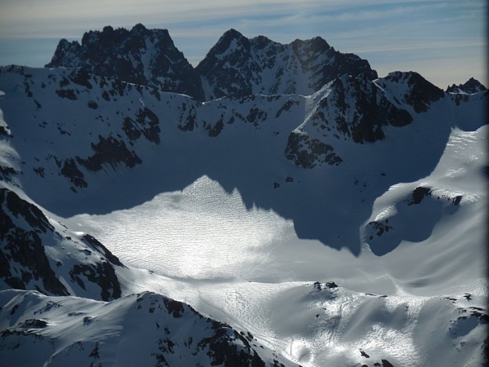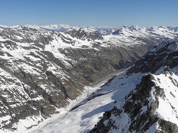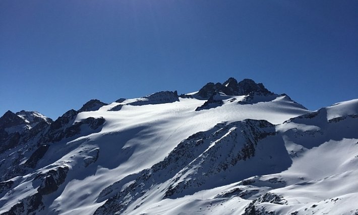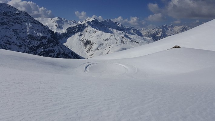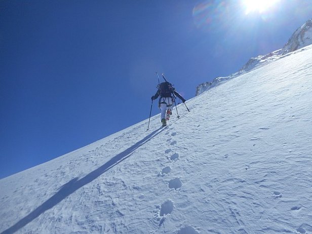 Après des nuits claires, les conditions de randonnées étaient à chaque fois favorables le matin. En choisissant le bon moment, on trouvait de la neige gros sel parfaite. En cours de journée, le danger d’avalanche de neige mouillée augmentait à chaque fois légèrement. Néanmoins peu d’avalanches ont été observées. A moyenne altitude, la neige se faisait de plus en plus rare, y compris sur les pentes exposées au nord. Les pentes orientées au sud étaient déjà sans neige jusqu’à haute altitude.