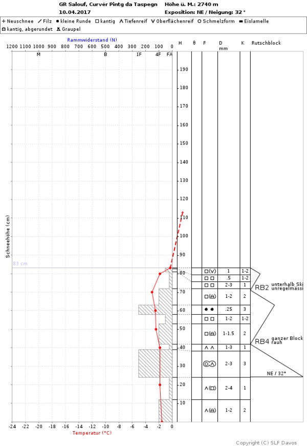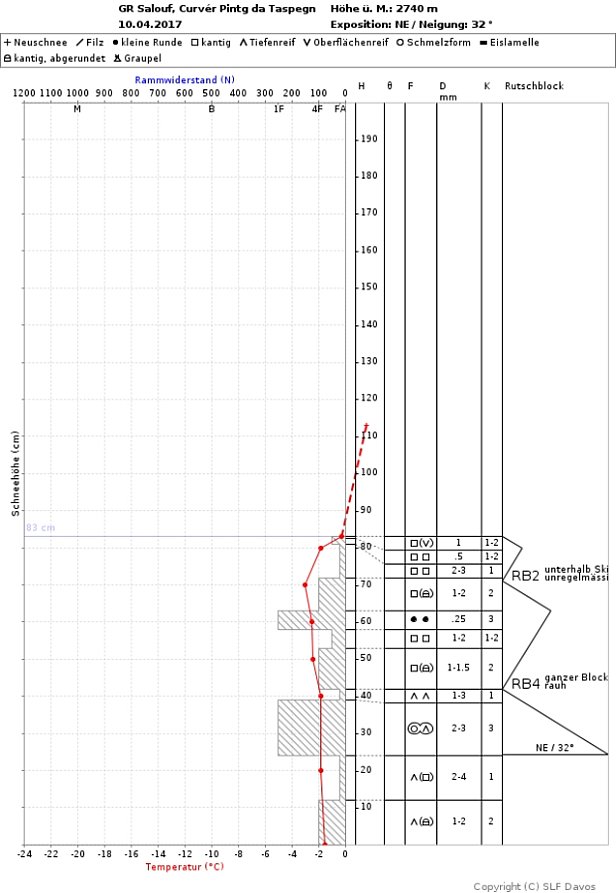 Le vendredi 7 avril, un danger limité d’avalanche de neige sèche était encore annoncé sur une grande partie de la crête principale des Alpes située dans le Haut-Valais. La raison en était la neige tombée du 1er au 3 avril (cf. rapport hebdomadaire précédent), qui ne s’était pas encore suffisamment stabilisée, surtout en altitude sur les pentes exposées au nord. Par la suite, un faible danger d’avalanche de neige sèche était annoncé partout. Ce n’était que pendant la nuit du lundi au mardi 11 avril qu’un danger limité d’avalanche de neige sèche était annoncé dans certaines régions du versant nord des Alpes. Etant donné que sur la quantité annoncée de neige fraîche pouvant atteindre 20 cm de hauteur, seuls quelques centimètres ont effectivement été enregistrés, il s’est avéré a posteriori que la prévision était erronée. Dans le bulletin d’avalanches, même pour un faible danger d’avalanche de neige sèche, le sud du Valais et une grande partie des Grisons avaient été traités à part. Dans ces régions, il était toujours mis en garde contre un danger lié à la neige ancienne fragile. La raison en était la constitution toujours défavorable du manteau neigeux (cf. figure 3) ainsi que les signaux d’alarme rarement observés (bruits sourds et fissures) dans le centre des Grisons. Aucun déclenchement d’avalanche dans la neige ancienne n’a toutefois été signalé à ce jour en avril, ni en Suisse ni au Tyrol et dans le Tyrol du Sud.