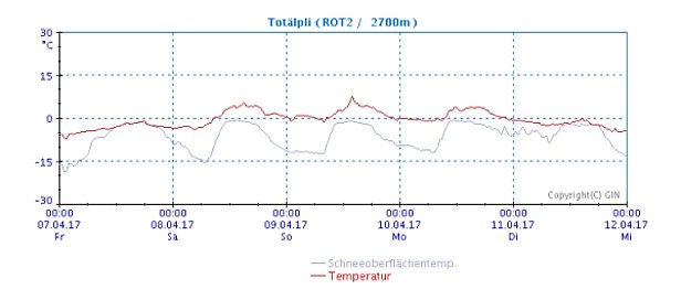 Le danger d’avalanche de neige mouillée augmentait à chaque fois un peu en cours de journée. En dépit de la température de l’air souvent élevée, la surface neigeuse se refroidissait fortement pendant les nuits généralement claires, grâce au rayonnement à longues ondes (cf. figure 4). La surface neigeuse était par conséquent souvent gelée et portante le matin et le manteau neigeux était stable. Les pentes raides exposées au nord au-dessus de 2600 m environ, où la surface neigeuse était parfois encore poudreuse, faisaient exception à cette règle. Une augmentation du danger d’avalanche de neige mouillée était annoncée à l’aide d’une double carte. A cet égard, il s’agissait à chaque fois d’une augmentation jusqu’au degré de danger limité (cf. Evolution du danger). Seulement quelques avalanches de neige mouillée ont cependant été observées (cf. figure 5).