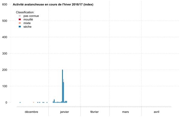 Avec de la neige fraîche et un vent fort à tempétueux de secteur ouest et nord-ouest, d’importantes accumulations de neige soufflée susceptibles de se décrocher facilement se sont formées les vendredi et samedi, tout particulièrement à haute altitude. La neige fraîche et la neige soufflée se déposaient sur un manteau de neige ancienne généralement mince. Surtout sur les pentes à l’ombre entre 2200 et 2800 m, celui-ci avait parfois subi intégralement une métamorphose constructive et était meuble ou renfermait parfois des croûtes durcies de regel ou d’anciennes couches de neige soufflée relativement dures. Le danger d’avalanche a ensuite augmenté jusqu’au degré 4 (fort) le vendredi dans l’extrême ouest, puis le samedi sur une grande partie de la crête nord des Alpes. Le danger concernait surtout les zones alpines de sports de neige. Etant donné qu’avant ces chutes de neige il n’y avait que très peu de neige voire pas de neige à moyenne altitude et dans les couloirs typiques d’avalanches, il ne fallait guère s’attendre à des avalanches descendant jusque dans les vallées. Le vendredi, seulement quelques avalanches ont été signalées, mais les conditions de visibilité étaient très limitées. On peut dès lors difficilement évaluer si le degré de danger 4 a effectivement été atteint. Les samedi et dimanche, l’indice d’activité avalancheuse a ensuite sensiblement augmenté (cf. figure 5). La plupart des avalanches ont alors été déclenchées artificiellement lors d’opérations de sécurisation. Peu d’avalanches spontanées ont été signalées, mais au cours de ces journées également, la visibilité était mauvaise dans les principales régions touchées par les précipitations. A posteriori, on a d’ailleurs observé de nombreuses avalanches recouvertes de neige fraîche (cf. figure 6).