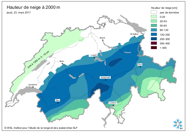 Avec un vent de secteur sud de plus en plus fort, le temps dans le nord était nuageux le mercredi et partiellement ensoleillé le jeudi. Sur le centre du versant sud des Alpes, mais également dans les régions avoisinantes au nord, les précipitations étaient persistantes. La limite des chutes de neige était descendue depuis 2000 m à environ 1600 m. Dans la nuit du mercredi au jeudi, les précipitations étaient intenses dans l’ouest du Tessin. Globalement, on enregistrait souvent de 70 à 100 mm de pluie dans cette région (cf. figure 5). Dans l’ouest du Tessin, sur certaines parties de la crête principale des Alpes situées dans le Haut-Valais ainsi que dans le sud de la vallée d’Urseren, le danger d’avalanche était évalué au degré „fort“ (degré 4) le jeudi. A partir du jeudi matin, de grandes avalanches ont été signalées surtout dans le sud des Alpes uranaises (cf. figure 6). Au moment de la clôture de la rédaction, il était toutefois encore trop tôt pour se faire une idée globale de la situation. De plus, un apport supplémentaire de neige d’environ 30 cm était encore attendu jusqu’au vendredi 24 mars dans les principales régions touchées par les précipitations. L’évolution de la situation sera décrite dans le prochain rapport hebdomadaire qui paraîtra le vendredi 31 mars.