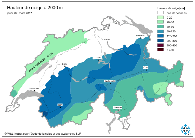 - Jura au-dessus de 1400 m environ: dans l’extrême ouest, de 30 à 50 cm; ailleurs, souvent de 20 à 30 cm; dans le nord, moins de neige fraîche