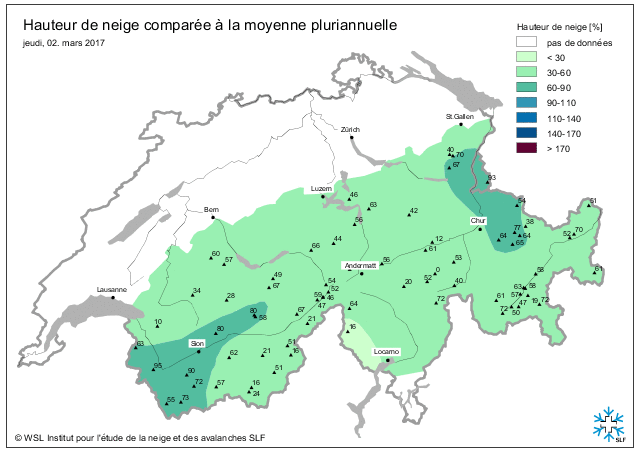 Malgré les chutes de neige au cours de cette période examinée par le rapport hebdomadaire, l’enneigement est resté en général inférieur à la moyenne. A 2000 m, la neige était la plus abondante dans les régions les plus occidentales du versant nord des Alpes ainsi que dans une bande allant de l’est de l’Oberland bernois jusque dans la région de l’Alpstein en passant par la Suisse centrale avec de 120 à 200 cm neige. C’est dans les vallées du sud de la Viège, dans le sud de la région du Simplon ainsi que dans le centre de l’Engadine, dans le val Poschiavo et dans le val Müstair qu’il y avait le moins de neige avec quelque 20 à 50 cm (hauteurs de neige à 2000 m).