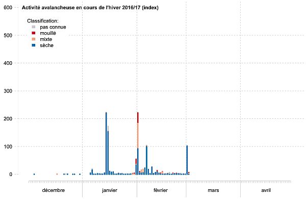 Le mardi 28 février, le danger d’avalanche a ensuite augmenté rapidement sur une grande partie du territoire en raison de la neige fraîche et du vent. Par la suite, les conditions demeuraient délicates, avec même un fort danger d’avalanche dans les régions les plus occidentales du Valais pendant la nuit du mercredi 1er au jeudi 2 mars. De bons résultats des opérations de minage ainsi que des départs spontanés d’avalanches confirmaient la situation avalancheuse délicate, surtout dans les principales régions du Valais et du sud des Grisons touchées par les précipitations. Le mercredi 1er mars, l’indice d’activité avalancheuse affichait, pour la première fois depuis le début de février, à nouveau une hausse sensible (cf. figure 7).