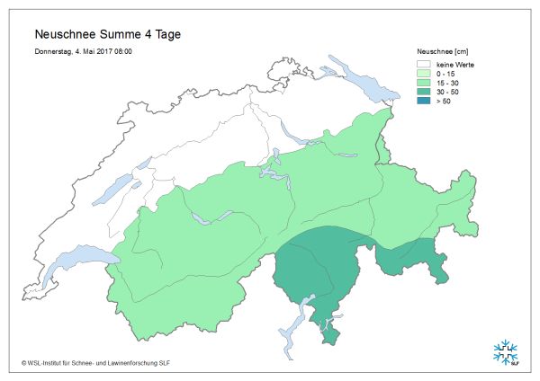 Des conditions avalancheuses critiques régnaient sur une grande partie du territoire. Là où le vent jouait un rôle, des avalanches pouvaient être déclenchées facilement. Des signaux d’alarme tels que des bruits sourds et la formation de fissures lors du passage sur le manteau neigeux ont été signalés. A posteriori, le degré de danger 4 (fort) aurait été justifié dans les principales régions touchées par les précipitations, non seulement le jeudi 27 avril mais également le vendredi. Avec quelque 50 cm de neige fraîche, il y est tombé nettement plus de neige que prévu dans la nuit du jeudi au vendredi.