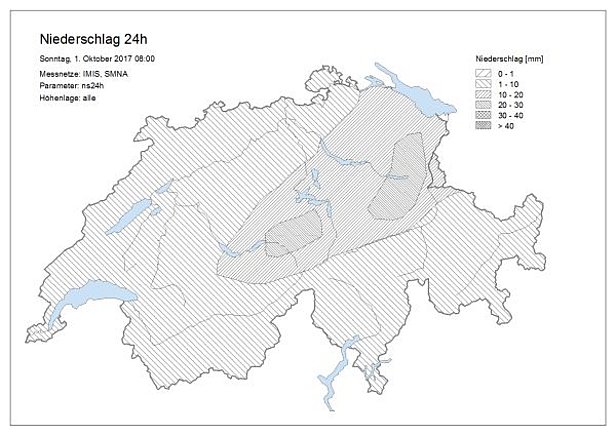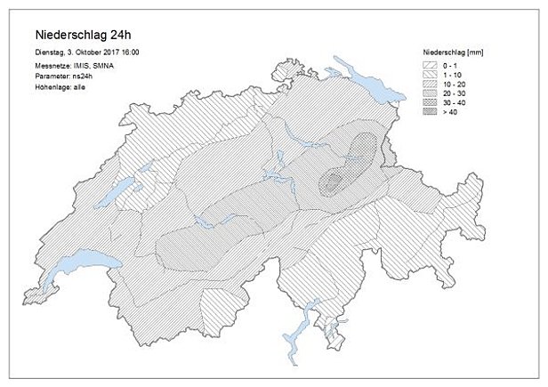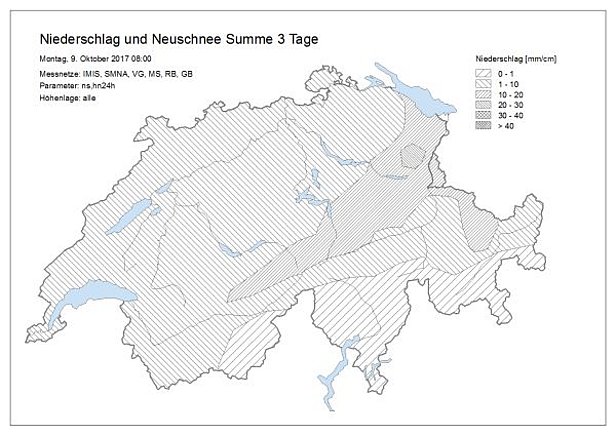 Le dimanche 1er octobre était ensoleillé dans l’ouest et en général en altitude. Les lundi 2 et mardi 3 octobre, le passage d’un front froid a apporté des précipitations surtout dans l’ouest et le nord. La limite des chutes de neige était en permanence élevée et se situait aux alentours de 3000 m. Ce n’est que tout à la fin des précipitations qu’elle est descendue à environ 2400 m dans l’est. La neige n’a persisté essentiellement qu’en haute montagne (cf. figure 3).