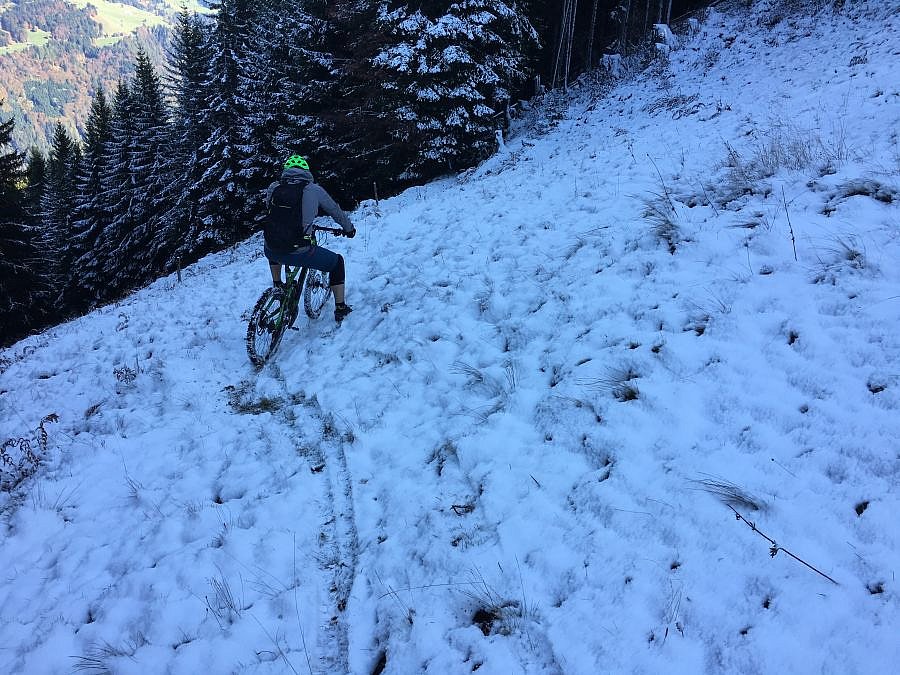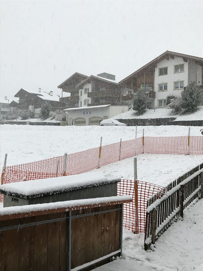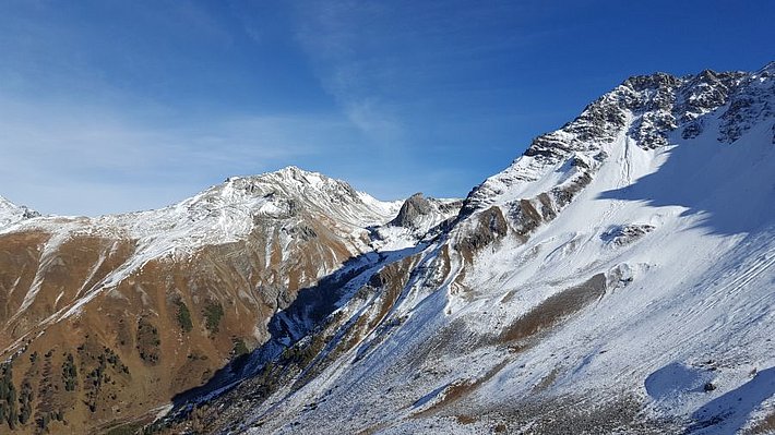 A la fin du mois, il y a eu à nouveau une alternance de précipitations dans le nord et de journées automnales ensoleillées (cf. photo 9). Le vendredi 27 octobre, de 5 à 10 cm de neige sont tombés dans le nord et jusqu’à 20 cm dans la Silvretta, mais le samedi 28 octobre était ensoleillé. Le dimanche 29 octobre, la tempête „Herwart“ est passée au nord de la Suisse donnant lieu à un très fort vent du nord avec des vitesses record tout particulièrement sur le versant sud des Alpes. Pendant la nuit du dimanche au lundi 30 octobre, l’air froid a ensuite atteint la Suisse entraînant une baisse de la limite des chutes de neige jusqu’à 1000 m. Sur le centre et l’est du versant nord des Alpes, on enregistrait jusqu’à 30 cm de neige fraîche au-dessus de 2400 m environ (cf. photo 8). Au cours de cette phase également, il n’y a pratiquement pas eu de précipitations dans le sud. Un bulletin d’avalanches a été diffusé les 27 et 28 octobre.