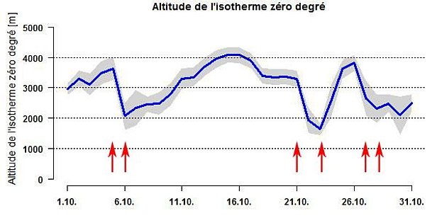 Globalement, le mois d’octobre était trop doux, tout particulièrement à la mi-octobre, grâce à un été indien particulièrement ensoleillé. L’isotherme zéro degré se situait en général en haute montagne, c’est-à-dire à une altitude exceptionnellement élevée pour un mois d’octobre. Les incursions d’air froid les plus marquées ont eu lieu les 6 et 23 octobre (cf. figure 1).