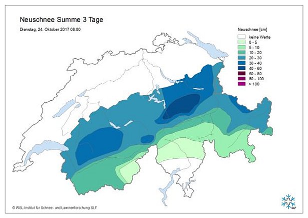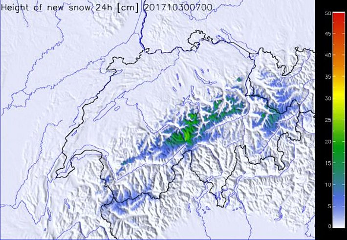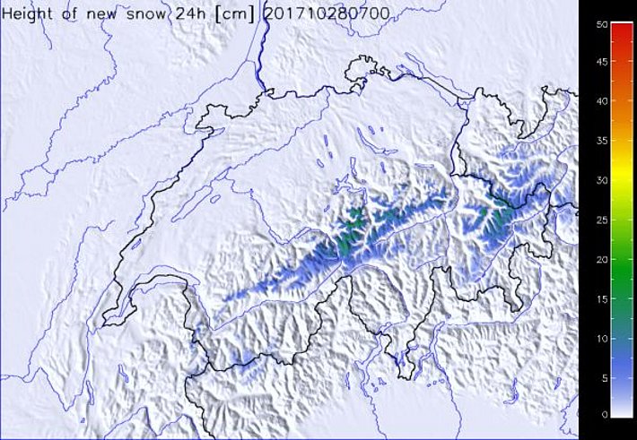 Les dimanche 22 et lundi 23 octobre, l’hiver a à nouveau pointé le bout de son nez. Les quantités de précipitations étaient impressionnantes, mais surtout dans les modèles météorologiques. Ces derniers expliquent pourquoi une préalerte de fortes chutes de neige a été diffusée le samedi 21 octobre (à l’attention des services des avalanches, information non accessible au public). Celle-ci mentionnait avec une probabilité de 40 à 70% une hauteur de neige fraîche d’un mètre en trois jours sur le versant nord des Alpes. A posteriori, ce mètre de neige fraîche n’a largement pas été atteint. Sur une grande partie du versant nord des Alpes, on enregistrait au-dessus de 2000 m environ de 20 à 30 cm de neige fraîche et dans une zone centrale du Schächental ainsi que dans les Alpes schwyzoises et glaronnaises de 40 à 60 cm (cf. figure 6). Cette situation a été décrite dans les bulletins d’avalanches des 21 et 23 octobre.