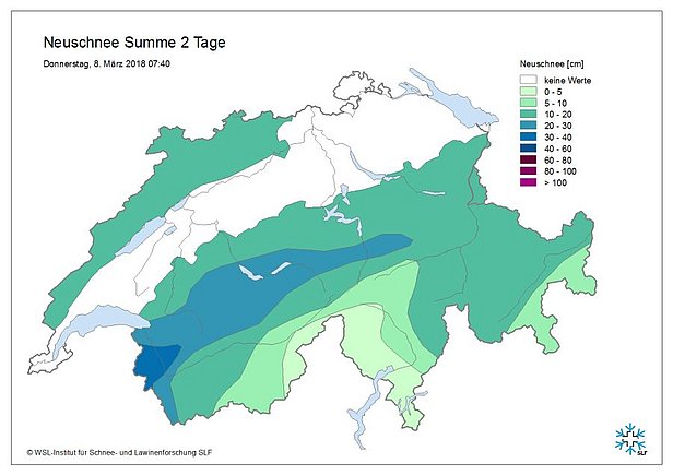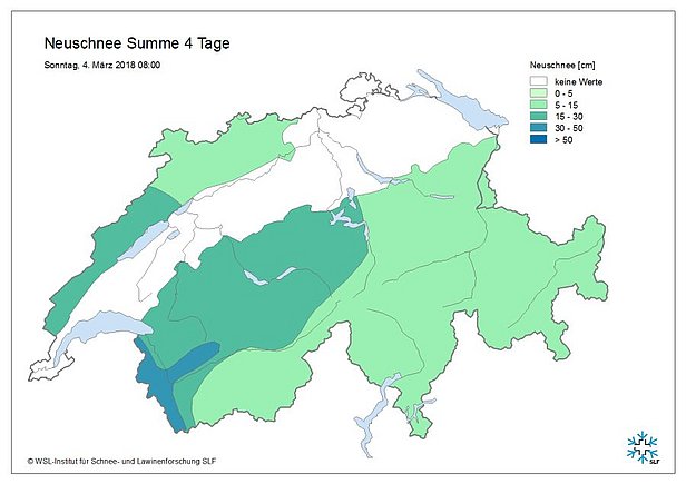 Globalement, du mercredi matin au dimanche matin, il a neigé par intermittence surtout dans l'ouest, l'apport de neige étant le plus important dans l'ouest du Bas-Valais, dans le Chablais, à Ovronnaz et à Montana avec une hauteur de neige fraîche de 30 à 50 cm (cf. figure 1).