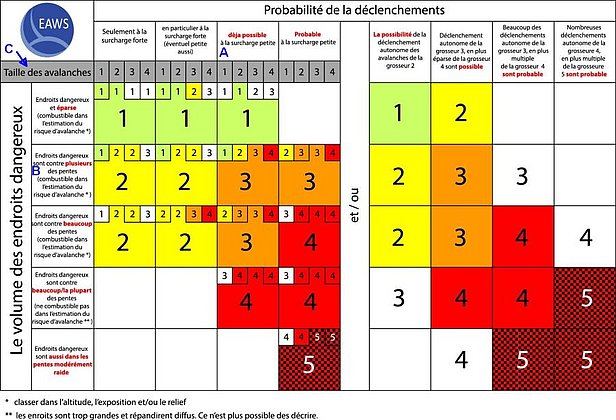Avec la matrice ci-après élaborée par les services européens de prévision d'avalanches (EAWS), on s'est efforcé d'attribuer les cinq degrés de danger en fonction des différents niveaux d'importance de ces trois critères (cf. figure 5). Cette matrice a pour but d'uniformiser davantage l'utilisation des degrés de danger par les divers services de prévision d'avalanche.