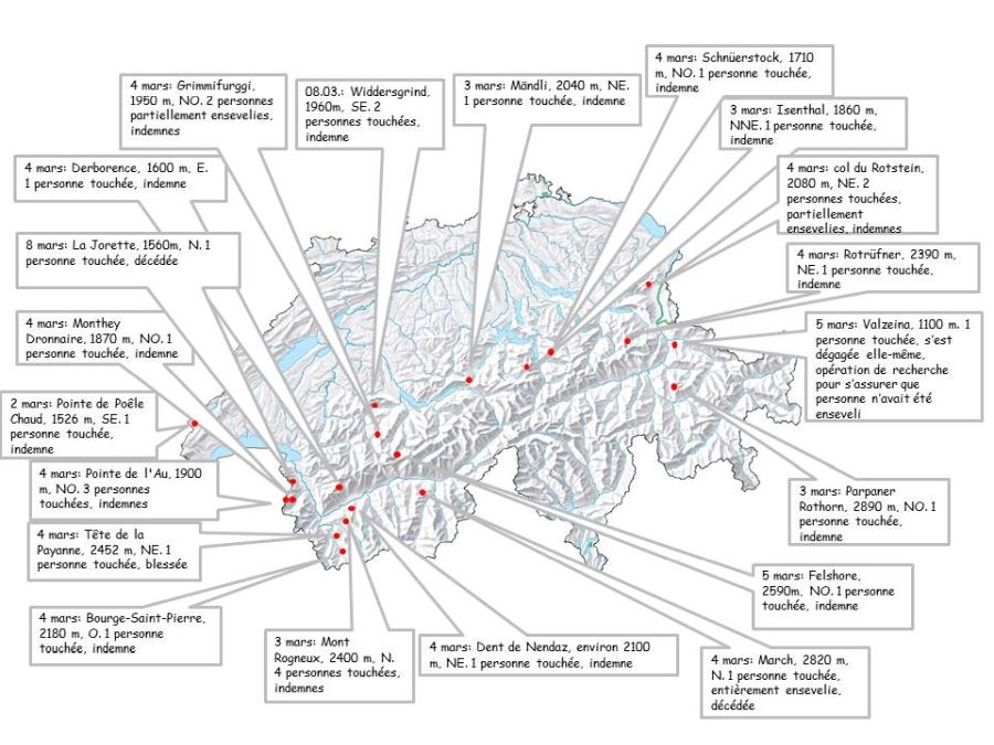 Pendant cette période examinée par le rapport hebdomadaire, la neige fraîche et le vent ont constamment donné lieu à la formation d'accumulations de neige soufflée qui, en raison du substrat défavorable, pouvaient se décrocher très facilement. Le week-end des 3 et 4 mars, il y a eu divers déclenchements d'avalanches par des personnes et dans toute la periode examinée malheureusement deux tués.