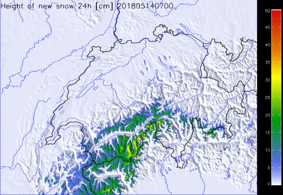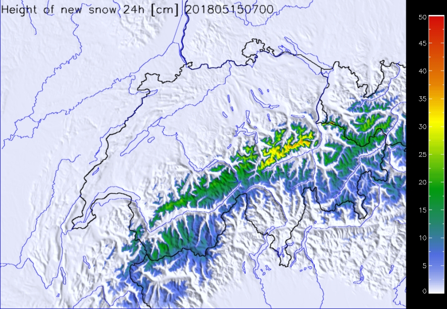 Le dimanche 13 mai, il est tombé quelque 10 cm de neige en haute montagne sur la crête principale des Alpes du Haut-Valais et dans les vallées de la Maggia. Au début de la semaine, Boniface et Sophie, les deux derniers saints de glace n‘étaient pas vraiment fidèles à leur réputation. Ils n‘ont pas apporté de gel en plaine, mais néanmoins une offensive hivernale en montagne avec de la neige jusque dans le voisinage de la limite de la forêt. Au cours de la nuit du dimanche au lundi, 30 cm supplémentaires de neige sont tombés sur la crête principale des Alpes du Haut-Valais et dans l’ouest du Tessin (cf. la série de photos 2, 1ère photo), puis dans la nuit du lundi au mardi de 30 à 40 cm sur le centre et l’est du versant nord des Alpes (cf. la série de photos 2, 2ème photo). Dans les principales régions touchées par les précipitations, un danger marqué (degré 3) d’avalanches de neige sèche était à chaque fois annoncé au-dessus de 2500 à 3000 m.