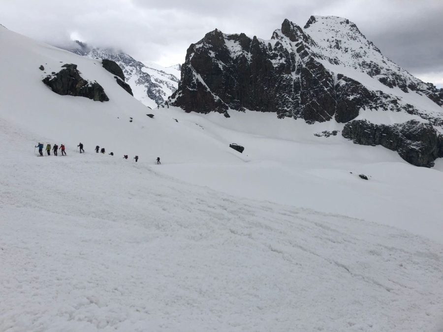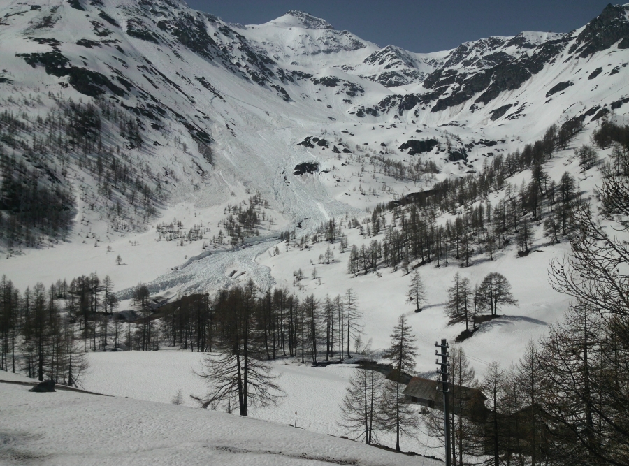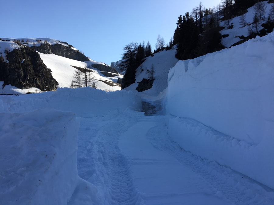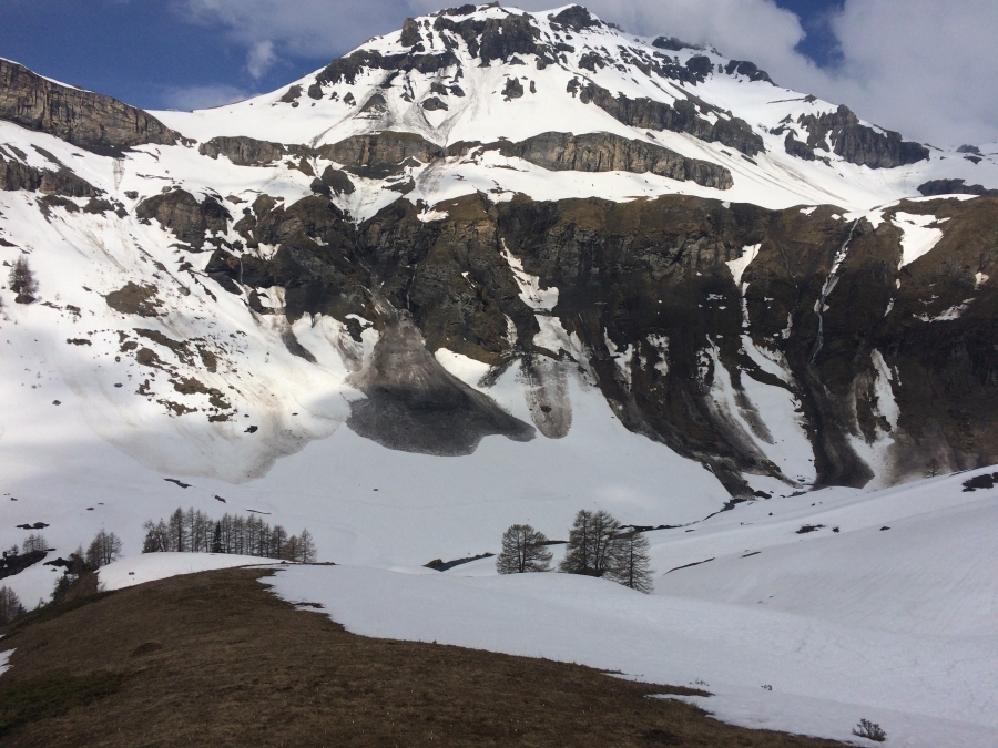 Après des chutes de neige relativement importantes, la situation avalancheuse était critique en haute montagne depuis Zermatt jusque dans la région du Simplon au début de la période examinée. Ailleurs, d’assez bonnes conditions prévalaient à chaque fois le matin, suivies par une légère augmentation du danger d’avalanche de neige mouillée en cours de journée. Sous l’effet des nuits seulement partiellement claires et d’averses en soirée, la fonte de la neige a fortement progressé (cf. photo 1), de sorte qu’à haute altitude les hauteurs de neige ont diminué jusqu’à des valeurs habituelles en cette saison. A partir du lundi 14 mai, des chutes de neige jusque dans le voisinage de la limite de la forêt ont donné lieu à une nette augmentation du danger d’avalanche de neige sèche.