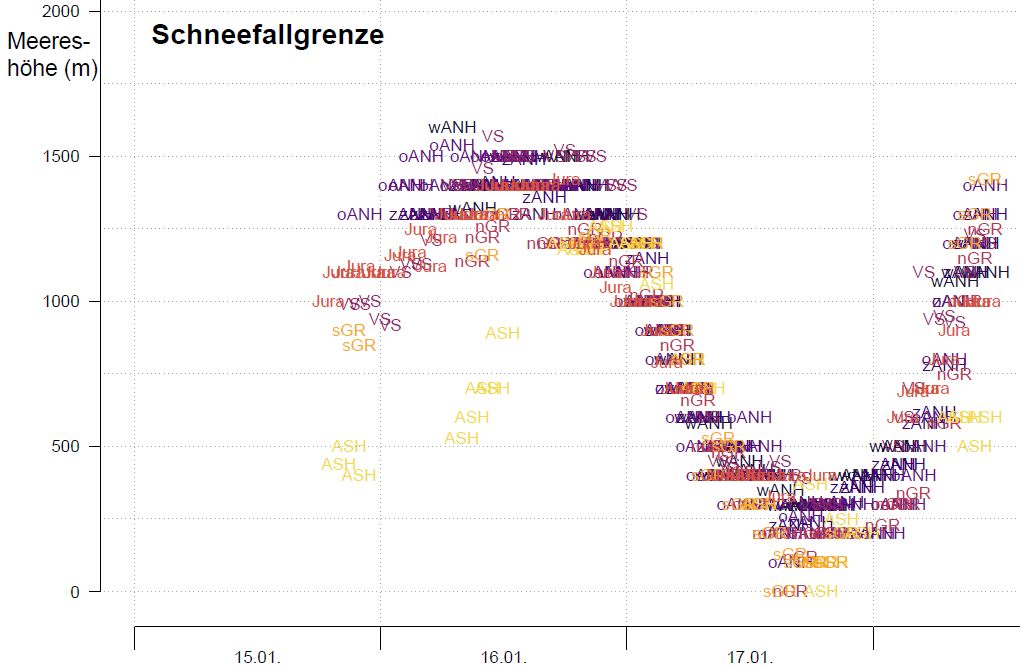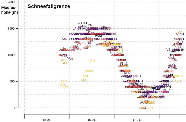 Dans la nuit du lundi au mardi, il y a eu des chutes de neige. Dans le nord, la limite des chutes de neige se situait d’abord à près de 1500 m, mais le mercredi, elle est descendue à basse altitude, avant de remonter le jeudi à nouveau aux alentours de 1500 m dans le nord (cf. figure 6). Le vent était souvent fort à tempétueux de secteur ouest. Ce n’était que dans le centre et le sud du Tessin que la tempête n’a guère été ressentie: le vent était généralement modéré et il n’y a eu que de faibles chutes de neige. Entre lundi soir et jeudi après-midi, les quantités suivantes de neige étaient tombées au-dessus de 1500 m (cf. également la figure 7):