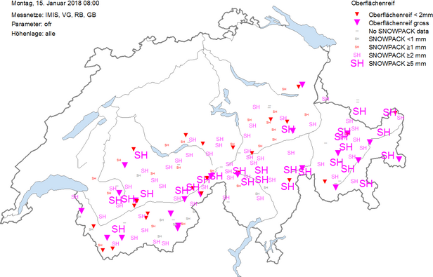 Alors que sur le Plateau central et le vendredi également à moyenne altitude, il y avait une couverture de brouillard élevé assez tenace, le temps était très ensoleillé en montagne avec des températures de l’air à 2000 m aux alentours de -4 °C et un vent quasi nul. Ce n’est que le lundi que l’approche de la dépression cyclonale „Evi“ a donné lieu à une augmentation de la nébulosité dans l’ouest et à une intensification continue du vent de secteur ouest.