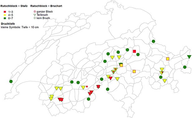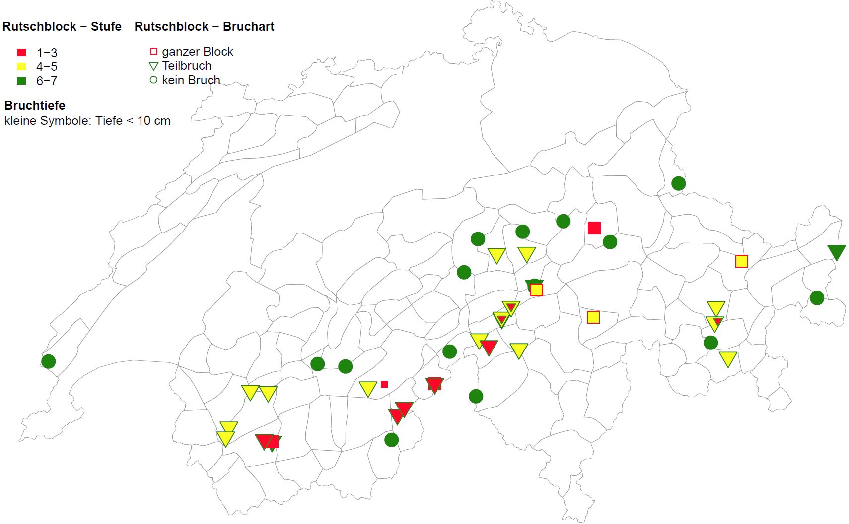 La situation avalancheuse s’est détendue très rapidement. Alors que le mardi 9 janvier de nombreuses grandes avalanches s’étaient encore déclenchées spontanément tout particulièrement dans le Haut-Valais (voir rapport hebdomadaire précédent), on n’a pratiquement plus signalé de déclenchements d’avalanches à partir du vendredi. Même le week-end, lorsqu’énormément de randonneurs profitaient des conditions favorables, une seule avalanche de neige sèche déclenchée par des personnes a été signalée (cf. photo 1). Les tests de stabilité confirmaient également la situation avalancheuse favorable sur une grande partie du territoire. Les régions intra-alpines faisaient exception à cette règle, car aux endroits plus faiblement enneigés, il était parfois encore possible de provoquer des ruptures dans la neige ancienne (cf. figure 2) avec des niveaux de charge moyens. Même si les avalanches de neige sèche étaient très rares, il y a néanmoins encore eu quelques avalanches de glissement d’ampleur moyenne (cf. photo 3).