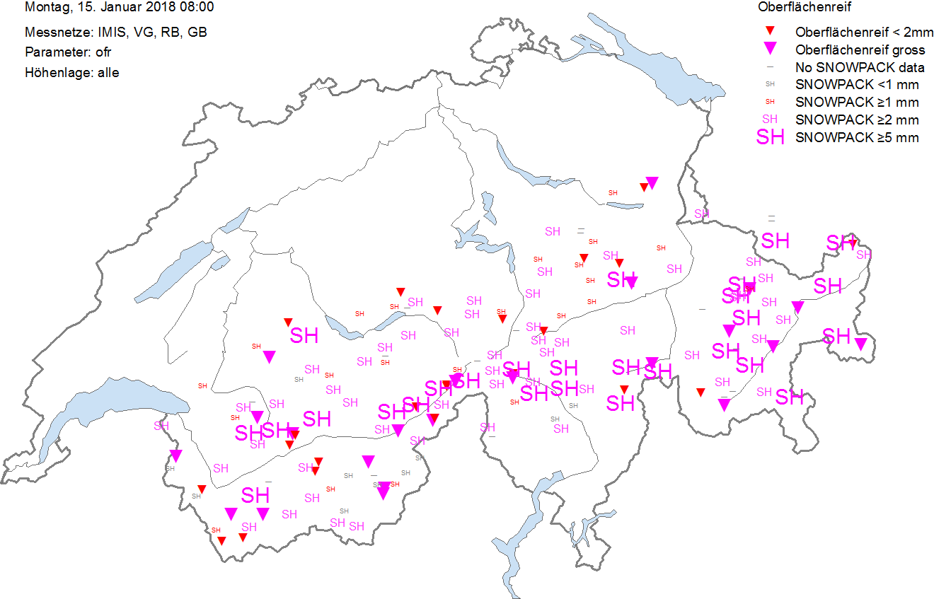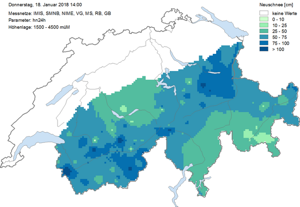 Du mardi 16 au jeudi 18 janvier: Les tempêtes hivernales „Evi“ et „Friederike“ apportent beaucoup de neige fraîche et, sur une grande partie du territoire, des conditions avalancheuses critiques ¶