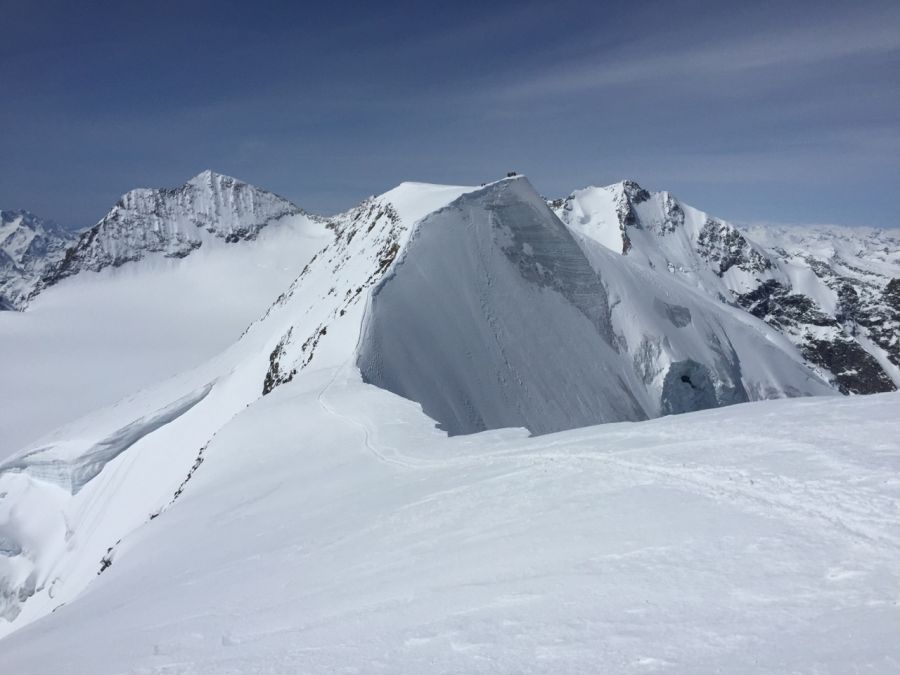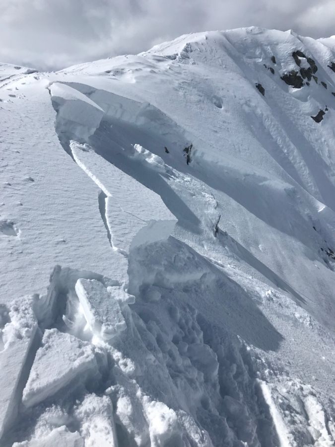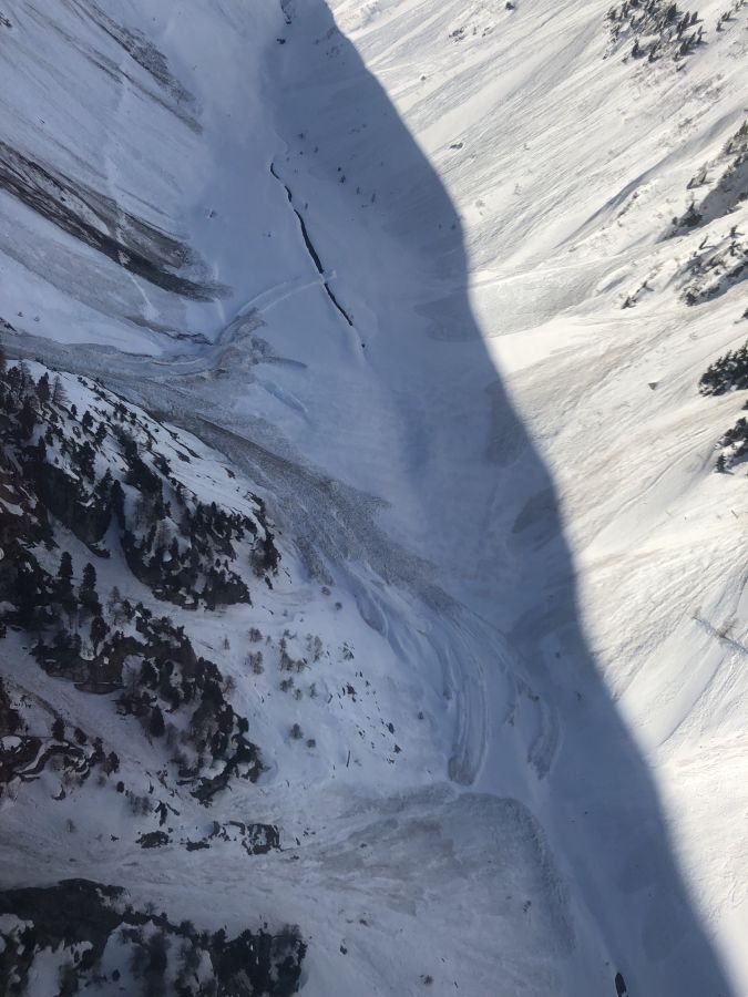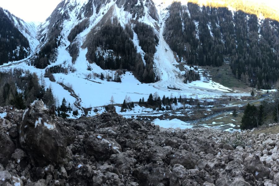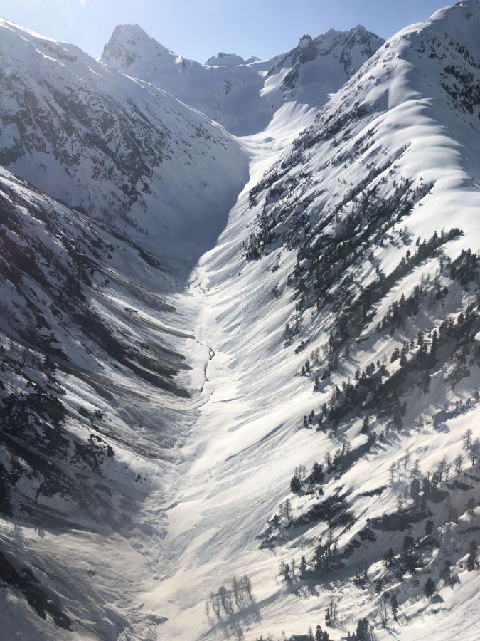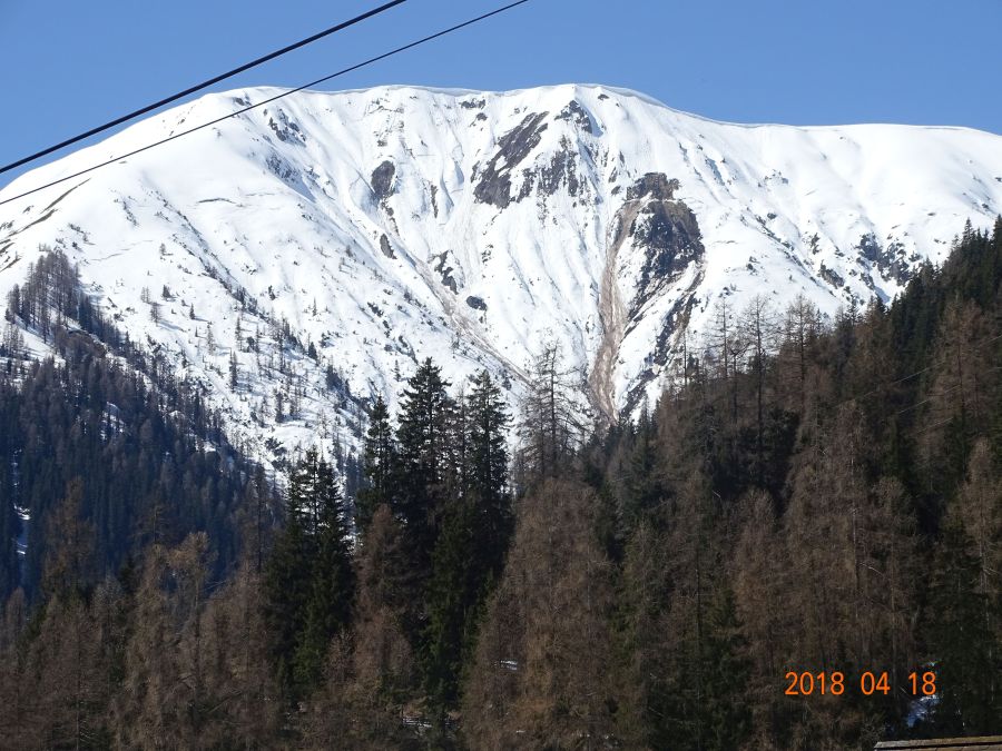Pendant cette période couverte par le rapport hebdomadaire, le danger d'avalanche était ensuite de plus en plus déterminé par une augmentation marquée en cours de journée, avec généralement des conditions favorables le matin et une forte augmentation du danger d'avalanches de neige mouillée et d'avalanches de glissement pendant la journée. A posteriori, le degré de danger 4 (fort) d'avalanches de neige mouillée en cours de journée prévu par le SLF pour le mercredi 18 avril n'a cependant pas été atteint. Dans les régions au sud de l'axe Rhône-Rhin, le danger d'avalanche de neige sèche était dû à la neige soufflée fraîche en haute montagne ainsi qu'aux couches fragiles relativement anciennes se trouvant plus profondément dans le manteau neigeux. Le premier début d'humidification sur les pentes de haute altitude exposées au nord a fragilisé le manteau neigeux dans une bande d'altitude d'environ 2200 à 2600 m. Des avalanches de neige mouillée se sont décrochées sur les pentes raides aux expositions est à ouest en passant par le sud, parfois jusqu'à 3000 m d'altitude. Les pentes exposées au sud étaient de plus en plus souvent purgées sur de grandes superficies. Quelques grandes avalanches de plaque de neige ont été observées plus particulièrement en Engadine (cf. photo 4) et dans le centre des Grisons (cf. photo 5). Cela concernait principalement les pentes exposées au nord, qui ont en partie été humidifiées pour la première fois par la pluie dans la nuit du 15 au 16 avril.