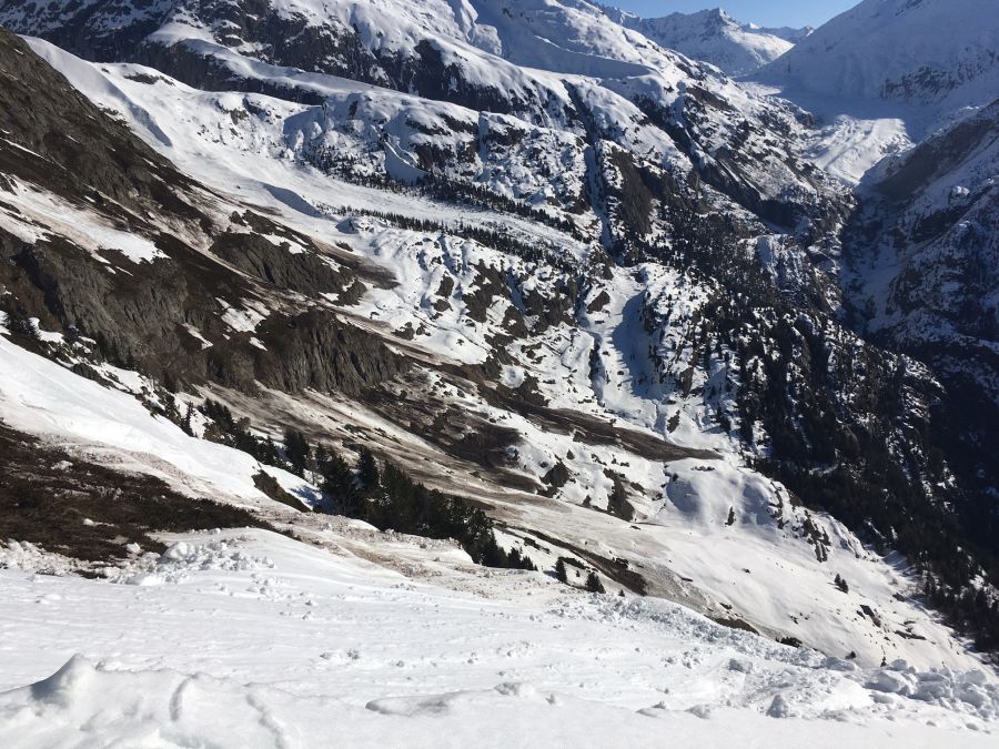 Après les chutes de neige qui ont cessé au début de cette période couverte par le rapport hebdomadaire, le danger d'avalanche de neige sèche avait nettement augmenté dans le sud atteignant le degré fort dans la nuit du jeudi au vendredi. Plus particulièrement dans le sud du Haut-Valais ainsi qu'en Haute-Engadine et au sud de ces régions, il y a eu davantage d'avalanches spontanées (cf. figure 3). Elles se décrochaient parfois dans la neige fraîche sous forme d'avalanches de neige meuble et s'étendaient à des couches plus profondes du manteau neigeux.