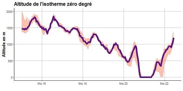 Sous l'influence du temps froid de cette semaine, la fonte de la neige a nettement diminué à basse et moyenne altitude par rapport à la semaine précédente. Le 22 mars, il y avait souvent sur les champs de mesure des observateurs du SLF (à environ 1500 m) encore de 100 à 200 cm de neige, et dans le centre du Valais, dans le centre des Grisons et en Engadine de 50 à 100 cm (cf. la carte des hauteurs de neige à 2000 m).