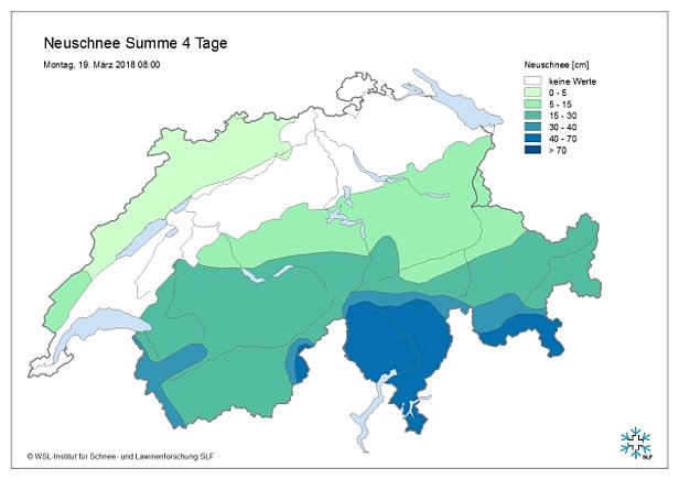Du jeudi 15 mars au vendredi matin, il est tombé de 15 à 25 cm de neige au-dessus de 1500 m environ dans le sud de la région du Simplon et sur le centre du versant sud des Alpes. Dans l’extrême ouest ainsi qu’en Engadine et au sud de ces régions, l’apport de neige était de 5 à 15 cm. Pendant la journée, il y a eu une pause dans les précipitations dans le sud et le temps y était assez ensoleillé tout comme dans les régions intra-alpines. Ailleurs, le ciel était généralement nuageux. Pendant la nuit, le vent de secteur sud était encore fort, mais le vendredi, il s’est orienté au secteur ouest à nord-ouest et était faible à modéré. Il a transporté la neige fraîche surtout dans le voisinage des crêtes et des cols du sud ainsi que sur la crête principale des Alpes. De samedi à dimanche, le temps était généralement très nuageux avec des chutes de neige au-dessus de 1500 m environ, celles-ci étant seulement temporaires dans le nord et l’est. L’apport de neige du jeudi au dimanche était le plus abondant dans le sud avec de 40 à 70 cm et localement jusqu’à 80 cm de neige fraîche (cf. figure 2). Au cours du week-end, le vent était généralement faible à modéré des secteurs sud et ouest.