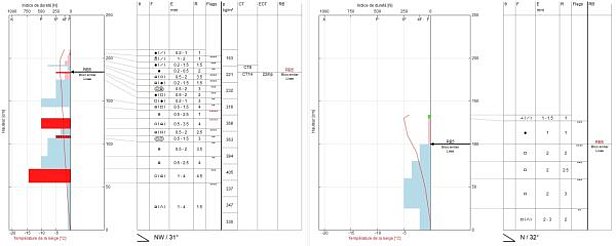 Comme précédemment, le manteau neigeux renfermait dans son mètre supérieur, surtout sur les pentes à l’ombre, des couches fragiles de grains grossiers parfois susceptibles de se décrocher. Plus les couches fragiles étaient recouvertes de neige, et plus ces couches superposées étaient dures (en raison de l’influence du vent ou de la présence de croûtes de regel) d’autant moins le risque d’y déclencher une avalanche était probable. Dans les régions au nord de l’axe Rhône-Rhin, la surcharge provoquée par des adeptes des sports d’hiver n’était guère suffisante pour provoquer un déclenchement. En revanche, dans les régions au sud de cet axe, le recouvrement des couches de neige ancienne susceptibles de se décrocher n’était parfois pas aussi épais ou compact, de sorte qu’il pouvait dans certains cas encore se décrocher. De tels endroits dangereux n’étaient pas reconnaissables, y compris pour les personnes expérimentées, ce qui rendait la situation avalancheuse trompeuse. Comme les conditions n’évoluaient que lentement dans le cas du problème lié à la neige ancienne, la prudence s’imposait encore également dans ces régions. Les couches de neige ancienne plus profondes et proches du sol avaient subi une métamorphose constructive à grains anguleux, surtout sur les pentes à l’ombre dans une bande d’altitude de 2000 à 2400 m ainsi que dans les régions avec moins de neige (cf. photo 4 et figure 5, les deux profils).