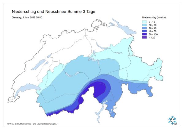 Dans le sud, il y a eu des précipitations le samedi après-midi. Celles-ci ont persisté jusqu'au mardi. Au début de la journée de dimanche, la limite des chutes de neige se situait en haute montagne, mais elle est ensuite descendue jusqu'à moyenne altitude. Les chutes de neige étaient les plus abondantes sur la crête principale des Alpes valaisannes le long de la frontière italienne ainsi que dans le nord-ouest du Tessin (cf. figure 3). Ces chutes de neige étaient accompagnées d'un vent généralement fort de secteur sud, qui a diminué le mardi.
