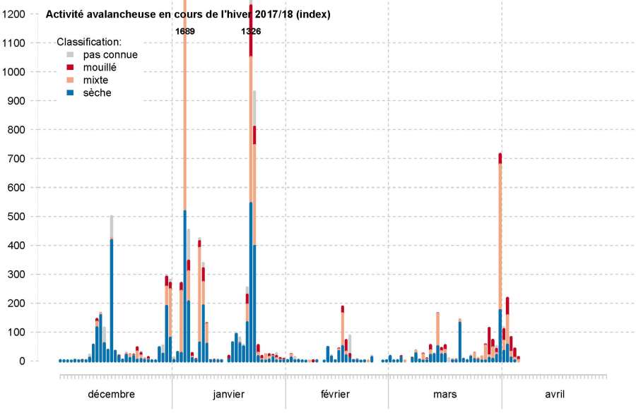 L'apogée de l'activité avalancheuse a été atteint le Vendredi saint (cf. figure 5). En dehors des pistes ouvertes, la situation était toutefois souvent encore très critique pour les randonnées et la pratique du hors-piste également le dimanche de Pâques et en raison du vent fort de secteur sud et du net réchauffement, aussi les jours suivants avec un danger marqué (degré 3) persistant d'avalanche de neige sèche ou de neige mouillée.