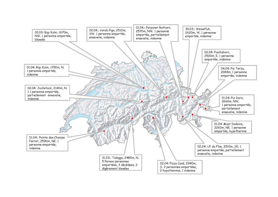 Pendant cette semaine examinée par le rapport hebdomadaire, 14 accidents d'avalanche touchant 20 personnes ont été signalés au SLF (cf. figure 6). Un grave accident d'avalanche est survenu le vendredi 31 mars dans la région de Fiescheralpe (VS), lorsqu'un groupe de cinq randonneurs a été touché et entièrement enseveli. Deux personnes ont subi des blessures légères, mais trois personnes ont perdu la vie dans l'avalanche. Huit avalanches ont provoqué des dégâts matériels à des voies de communication ou à la forêt ou ont donné lieu à des opérations de recherche à titre de contrôle.