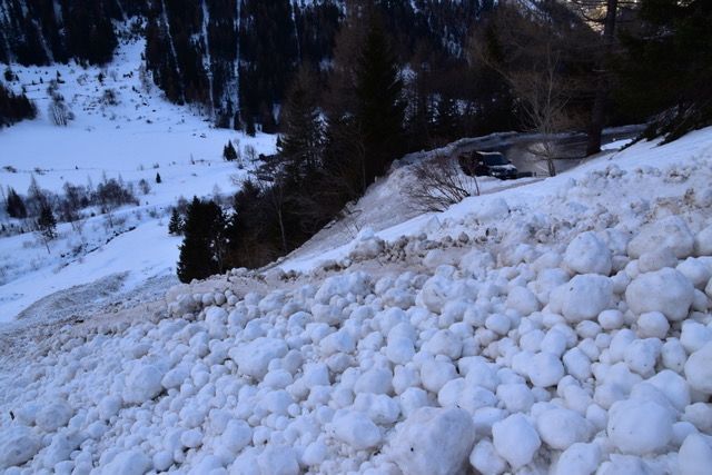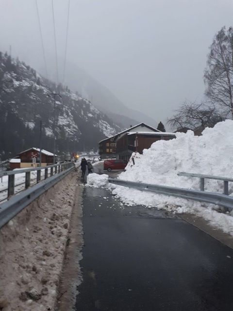 En raison des chutes de neige intenses et de la limite des chutes de neige temporairement élevée, le degré de danger 4 ("fort") a été annoncé le samedi pour le Valais et de grandes parties de l'ouest et du centre du versant nord des Alpes. En plus des avalanches spontanées partant de haute altitude et descendant localement jusque dans les vallées, de nombreuses avalanches de neige mouillée et avalanches de glissement se sont produites en dessous de 2200 m environ en raison de la limite élevée des chutes de neige. Des voies de communication exposées étaient menacées dans certaines régions. La route entre Täsch et Zermatt (VS), par exemple, a dû être fermée pour des raisons de sécurité (cf. photo 4).