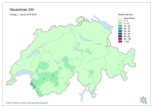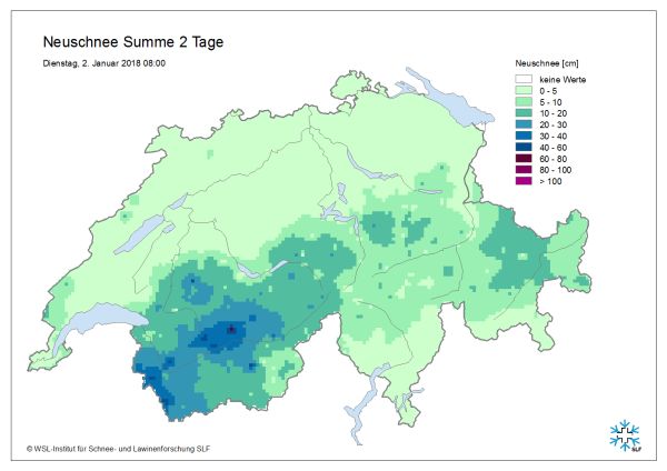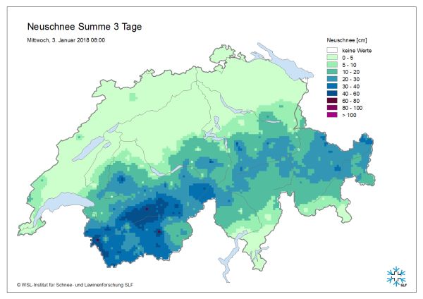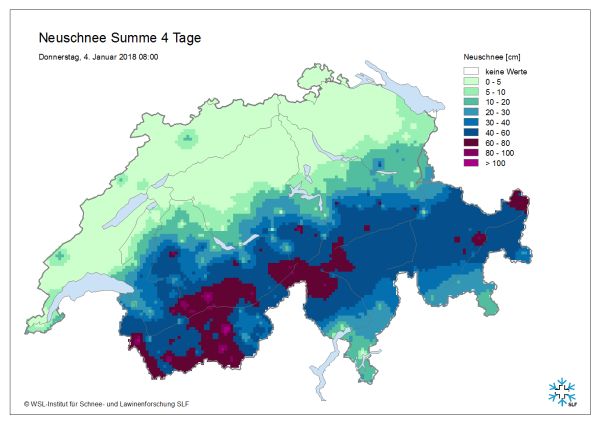 Certaines stations automatiques (réseau de mesure IMIS) donnaient en revanche une tout autre image: Les valeurs de neige fraîche les plus marquantes du jeudi matin 4 janvier étaient 83 cm à la station Oberer Stelligletscher et 81 cm à la station Triftchumme. Ces deux valeurs occupent respectivement les rangs 1 et 4 des 18 années de mesures.