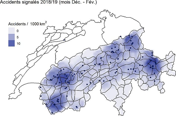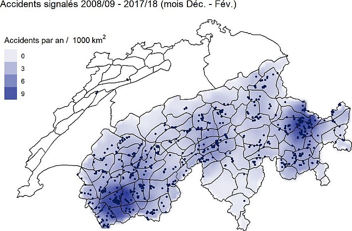 Si l’on examine la répartition géographique des accidents d’avalanche signalés en terrain non sécurisé – c’est-à-dire les accidents survenus lors de randonnées ou de la pratique du hors-piste – de cet hiver (pendant les mois de décembre à février, 96 accidents en terrain non sécurisé), on constate que comparativement beaucoup d’avalanches ayant donné lieu à un accident se sont produites sur l’ouest du versant nord des Alpes, dans le sud du Bas-Valais et dans la région de Davos (cf. figure 8a). Alors que les autres années, on dénombrait également relativement beaucoup d’accidents d’avalanche dans le sud du Bas-Valais et à Davos, cette année l’accumulation d’accidents sur l’ouest du versant nord des Alpes est particulièrement frappante (cf. figure 8b). Dans ces régions, cette accumulation s’explique certainement par la longue persistance du problème très marqué lié à la neige ancienne, qui au cours d’autres hivers était plutôt typique pour les régions intra-alpines du Valais et des Grisons.