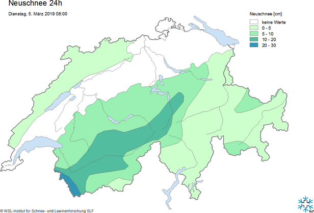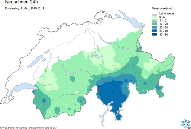 Le mercredi, le vent de secteur sud-ouest s’est à nouveau intensifié. Dans les Alpes, il était fort à tempétueux. Dans les vallées alpines, il faisait doux sous l’influence du foehn, avec jusqu’à +15 °C. Le mercredi après-midi, il y a eu des précipitations dans le sud. Depuis le 2 février, c’est-à-dire depuis près de cinq semaines, c’étaient les premières précipitations significatives sur le versant sud des Alpes. Le jeudi après-midi, l’apport de neige au-dessus de 1500 m atteignait 30 à 50 cm (cf. figure 3). Après la chute du foehn dans le nord, il a également neigé un peu au-dessus de 1500 m dans cette partie du pays. Le danger d’avalanche a augmenté jusqu’au degré 3 ou „marqué“ sous l’effet du vent fort et, dans une grande partie du sud, des abondantes chutes de neige.