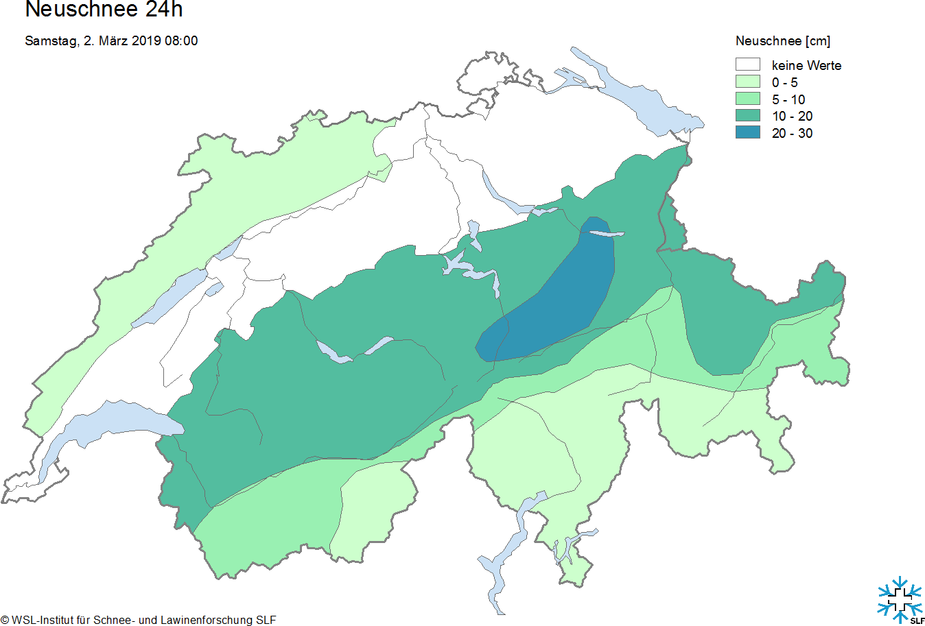 Avec le vent fort et temporairement tempétueux de secteur sud-ouest – un foehn parfois fort soufflait dans les vallées du nord des Alpes – la nuit était très douce dans le nord avec +6 °C à 2000 m. Pendant la journée, un front froid a traversé la Suisse. Sur le versant nord des Alpes, il a donné lieu à un refroidissement sensible de près de 10 degrés en l’espace de quelques heures. Au-dessus de 1200 m, il était également tombé un peu de neige fraîche, la quantité la plus importante étant enregistrée dans l’ouest du Bas-Valais avec jusqu’à 30 cm de neige fraîche (cf. figure 2).