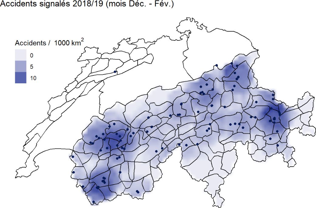 Le SLF enregistre tous les accidents d’avalanche signalés impliquant des personnes, c’est-à-dire toutes les avalanches ayant emporté au moins une personne. Depuis début mars, ces avalanches sont affichées sur une carte et dans un tableau sur le site Internet du SLF (cf. figure 7).