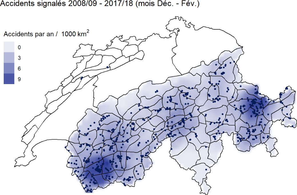 Si l’on examine la répartition géographique des accidents d’avalanche signalés en terrain non sécurisé – c’est-à-dire les accidents survenus lors de randonnées ou de la pratique du hors-piste – de cet hiver (pendant les mois de décembre à février, 96 accidents en terrain non sécurisé), on constate que comparativement beaucoup d’avalanches ayant donné lieu à un accident se sont produites sur l’ouest du versant nord des Alpes, dans le sud du Bas-Valais et dans la région de Davos (cf. figure 8a). Alors que les autres années, on dénombrait également relativement beaucoup d’accidents d’avalanche dans le sud du Bas-Valais et à Davos, cette année l’accumulation d’accidents sur l’ouest du versant nord des Alpes est particulièrement frappante (cf. figure 8b). Dans ces régions, cette accumulation s’explique certainement par la longue persistance du problème très marqué lié à la neige ancienne, qui au cours d’autres hivers était plutôt typique pour les régions intra-alpines du Valais et des Grisons.